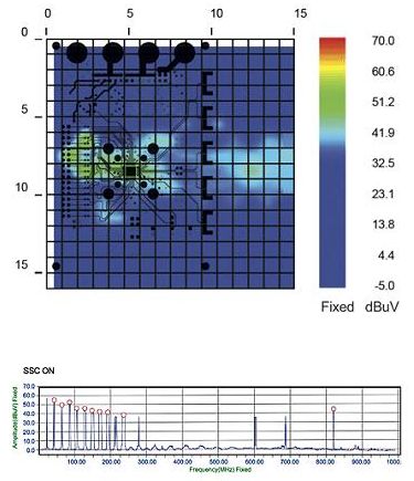 極近場(chǎng)掃描系統(tǒng)完成了空間和頻譜掃描后顯示并生成了以下輻射特性圖。需注意的是,掃描結(jié)果疊加在Gerber設(shè)計(jì)文件上,因此這樣對(duì)結(jié)果進(jìn)行分析可以立即確定待測(cè)器件中的具體輻射體。圖2顯示了SSCG功能為“關(guān)”時(shí)待測(cè)器件的輻射特性。