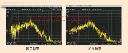 從圖中可見,在處理D類固有的周期性方波時,最基本的難題是諧振間隔時出現(xiàn)的集中能量。為了設(shè)計一個“安靜”的低EMI D類放大器,一個方法是將頻率來回抖動,或擴(kuò)展開關(guān)的頻譜,降低頻譜內(nèi)所有點上的能量。與傳統(tǒng)的D類放大器相比,擴(kuò)頻調(diào)制方案有幾個重要的優(yōu)點:除了可保持高效效率和低THD+N外,更重要的是大幅削減了輻射噪聲和EMI,如圖6中所示。