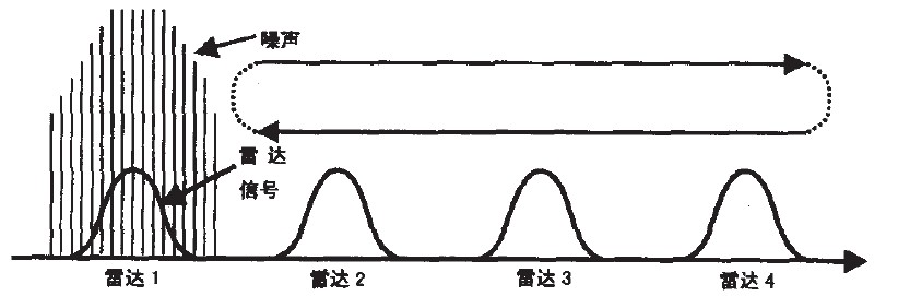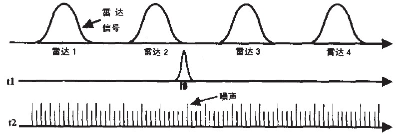 掃頻干擾方式主要在雷達的整個調(diào)諧頻帶內(nèi)重復(fù)進行點干擾,雖然此方式不能比寬帶噪聲干擾給出更多的平均功率,但是掃頻干擾使每個雷達周期性地承擔(dān)最大可能的功率。事實證明,通過調(diào)整掃描頻率以保持雷達通帶內(nèi)的干擾時間約等于雷達發(fā)射脈沖寬度,掃頻干擾方式在產(chǎn)生假目標方面是最有效的。并且對于掃描雷達,掃頻干擾可產(chǎn)生足夠可信賴的假目標。其工作方式如圖3所示。