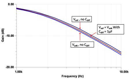 圖 7 INA333 使用 Cdiff 時獲得改善的噪聲濾波仿真情況