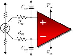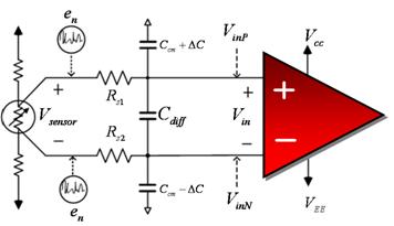 這種方法存在的問題是現(xiàn)貨電容都有一個 5% 到 10% 的典型容差,這就是說如果每條支線的 CCM 反向不匹配,總差動容差便會高達 20%。圖 3 更好地表示了這種電容不匹配,同時還顯示了電阻傳感器輸出端的共模噪聲輸入 (eN) 情況。