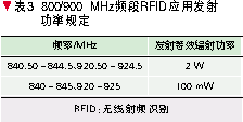 信息產(chǎn)業(yè)部于2007年4月23日發(fā)布了信部無(wú)[2007]205號(hào)文件《關(guān)于發(fā)布800/900 MHz頻段射頻識(shí)別(RFID)技術(shù)應(yīng)用試行規(guī)定的通知》,規(guī)定800/900 MHz頻段RFID技術(shù)的具體使用頻率為840~845 MHz和920~925 MHz.表3給出了發(fā)射功率的規(guī)定。