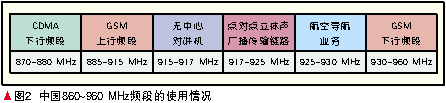 圖2顯示了中 國(guó)在860~960 MHz頻段的頻率使用現(xiàn)狀,920~925 MHz的RFID頻段實(shí)際上是立體聲廣播點(diǎn)對(duì)點(diǎn)傳輸業(yè)務(wù)頻段分出5 MHz與RFID共用,與GSM上/下行頻段只有5 MHz的頻率間隔,與無(wú)中心對(duì)講機(jī)系統(tǒng)只有3 MHz的頻率間隔。