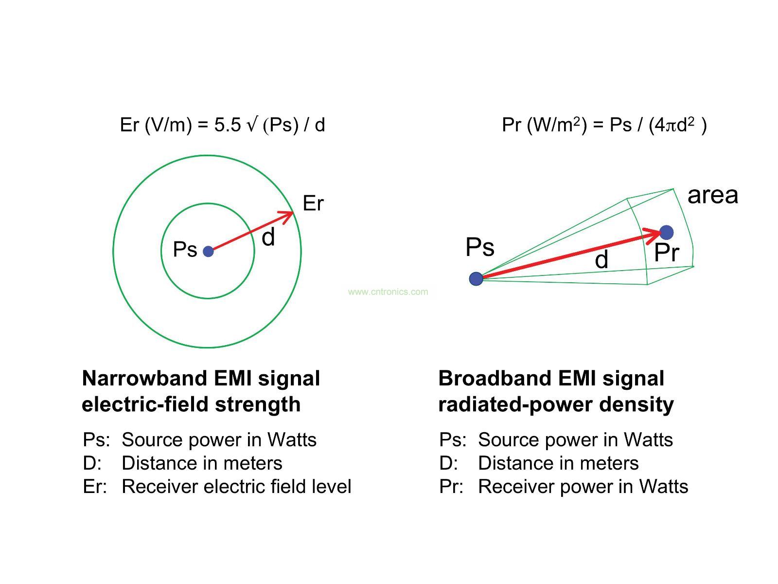 呈輻射狀的電磁干擾(EMI) 信號(hào)會(huì)從輻射源傳播至某個(gè)接收單元。根本而言,這些信號(hào)的功率或者電壓強(qiáng)度在“觸及”敏感的電路時(shí),取決于發(fā)送器的功率/天線增益以及輻射源和接收器之間的距離(請(qǐng)參見(jiàn)圖1)。