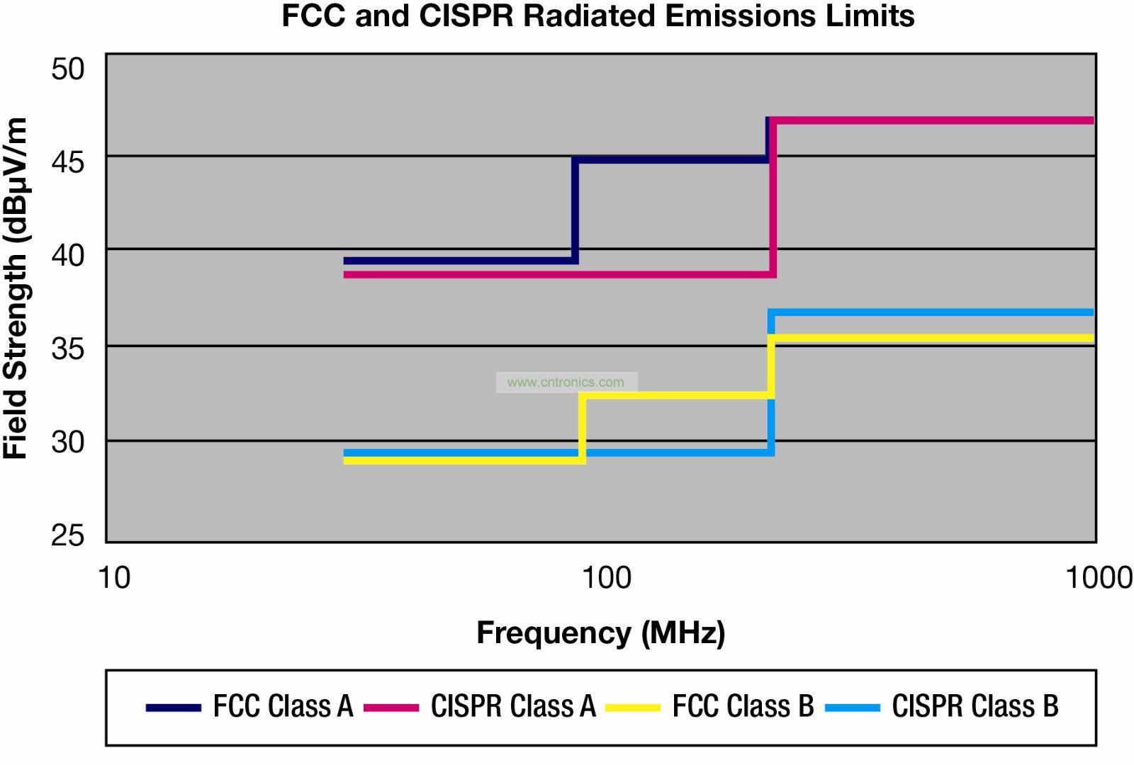 圖2 FCC 和CISPR 輻射限制—30MHz到1GHz,測(cè)量距離10m