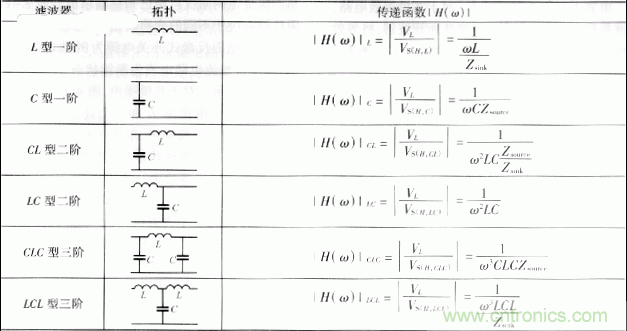 電磁干擾濾波器通常置于開關(guān)電源和電網(wǎng)相連的前端,是由串聯(lián)電抗器和并聯(lián)電容器組成的低通濾波器。如圖1所示,噪聲源等效阻抗為Zsource、電網(wǎng)等效阻抗為Zsink。濾波器指標(fstop和Hstop)可以由一階、二階或三階低通濾波器實現(xiàn),濾波器傳遞函數(shù)的計算通常在高頻下近似,也就是說對于n階濾波器,忽略所有ωk相關(guān)項(當(dāng)k<n),只取含ωn相關(guān)項。表1列出了多種常見的濾波器拓撲及其傳遞函數(shù)。特別要注意的是要考慮輸入、輸出阻抗不匹配給濾波特點帶來的干擾。