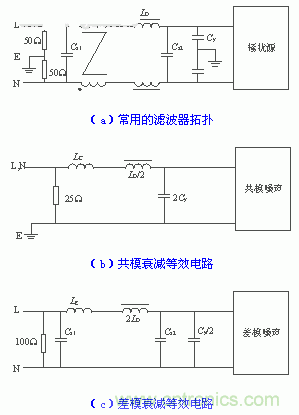 以常用的濾波器拓撲〔圖2(a)〕為例,分別對共模、差模噪聲濾波器等效電路進行分析。圖2(b)及圖2(c)分別代表濾波器共模衰減和差模衰減等效電路。分析電路可知,Cx1和Cx2只在抑制差模噪聲,理想的共模扼流電感LC只在抑制共模噪聲。但是,由于實際的LC繞制的不對稱,在兩組LC之間存在有漏感Lg也可在抑制差模噪聲。Cy即可抑制共模干擾、又可抑制差模噪聲,只是由于差模抑制電容Cx2遠大于Cy,Cy對差模抑制可忽略不計。同樣,LD既可抑制共模干擾、又可抑制差模干擾,但LD遠小于LC,因而對共模噪聲抑制作用也相對很小。