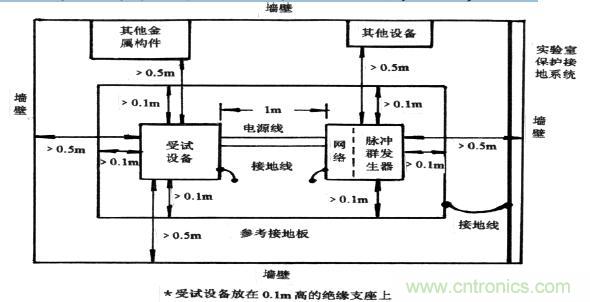 ① 試驗應(yīng)在試驗室中央進(jìn)行,除位于試品及試驗儀器下方的參考接地板外,它們與其他所有導(dǎo)電性結(jié)構(gòu)(例如屏蔽室里的墻壁和實驗室里的其他有金屬結(jié)構(gòu)的試驗儀器和設(shè)備)之間的最小距離為0.5m,以避免脈沖群干擾中輻射成分的反射,再與原先的干擾疊加,對試驗結(jié)果產(chǎn)生影響。