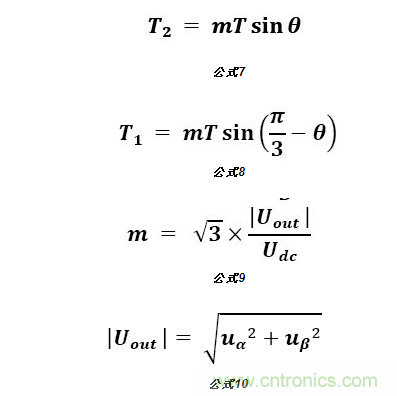 由此可知SVPWM實現(xiàn)步驟:先通過Uout判斷出電壓矢量所在扇區(qū),再根據(jù)相鄰的電壓矢量及Uout計算出兩個基本矢量作用時間;最后根據(jù)兩個基本矢量作用時間計算出PWM開關時間及占空比。