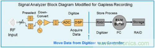 在對(duì)系統(tǒng)干擾進(jìn)行特征分析時(shí),系統(tǒng)工程師通常依賴(lài)信號(hào)分析儀來(lái)完成長(zhǎng)時(shí)間的連續(xù)錄存,如圖1所示。長(zhǎng)時(shí)間錄存的主要局限是,測(cè)試設(shè)備中板子的內(nèi)存容量不夠大。目標(biāo)信號(hào)首先進(jìn)入分析儀的RF輸入,隨后被處理,產(chǎn)生圖1右側(cè)所顯示的波形。假設(shè)系統(tǒng)使用了一個(gè)固定本機(jī)振蕩器,該儀器捕獲帶寬內(nèi)的所有目標(biāo)信號(hào)在到達(dá)藍(lán)色豎線之前,都會(huì)經(jīng)過(guò)實(shí)時(shí)處理。一旦采樣信號(hào)進(jìn)入緩存或RAM中,該儀器便不再關(guān)注新進(jìn)入的數(shù)字樣本。相反,它必須處理先前錄存的采樣數(shù)據(jù)。