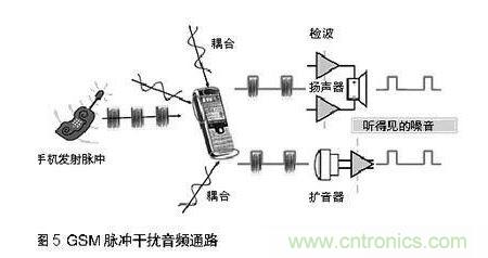 當(dāng)手機(jī)與基站通訊,或兩個手機(jī)彼此接近時,發(fā)射脈沖通過擴(kuò)音器,揚聲器,或頭戴式耳機(jī)線傳入音頻通路。見圖5,結(jié)果是音頻質(zhì)量大幅降低。