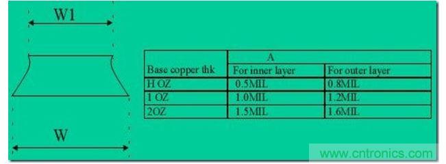 走線厚度T與該層的銅厚有對應(yīng)關(guān)系,具體如下: