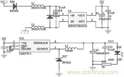 本控制模塊的電源電路如圖2所示。車載蓄電池—發(fā)電機的電源從24V_1處進入,二極管D16主要是防止電源的正負極被誤接反。電感L1、L2對電源進行濾波,和共模電感L3、電容C8配合,可以過濾掉電源中的尖峰脈沖。二極管D24 P6KE51A是脈沖干擾抑制器(TVS),它可以快速吸收超過額定電壓的尖峰脈沖,瞬時通過電流很大,最大功率可達500~1000W。電容E5和C9進一步對電源進行濾波。過濾干凈的電流通過開關電源芯片LM2576變換為系統(tǒng)使用的5V電源。電容E7和C11對輸出5V電源進行濾波,電阻R18和發(fā)光二極管D28指示當前是否有電。