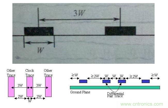 3W原則是指多個(gè)高速信號(hào)線長距離走線的時(shí)候,其間距應(yīng)該遵循3W原則,例如時(shí)鐘線,差分線,視頻、音頻信號(hào)線,復(fù)位信號(hào)線及其他系統(tǒng)關(guān)鍵電路需要遵循3W原則,而并不是板上所有的布線都要強(qiáng)制符合3W原則。