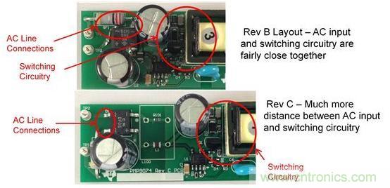 圖2.從電路板布局進(jìn)行 EMI 掃描,其中 AC 輸入與開(kāi)關(guān)電路距離較近