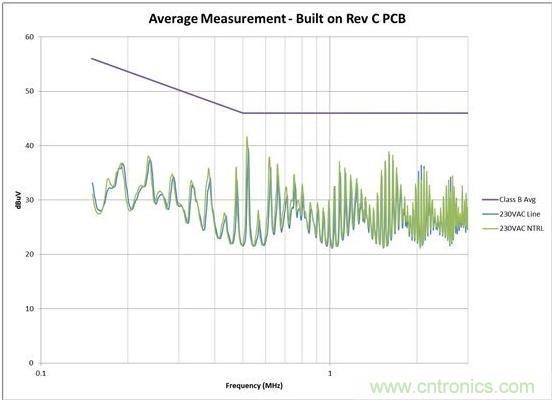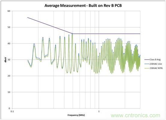 我通過(guò)簡(jiǎn)單調(diào)整電路板(無(wú)電路變化),將噪聲降低了大約 6dB。見(jiàn)圖 2 和圖 3 的測(cè)量結(jié)果。在有些情況下,接近高 dV/dt 進(jìn)行輸入線路布線甚至還可擊壞共模線圈 (CMC)。