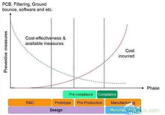 圖1:當(dāng)產(chǎn)品在開(kāi)發(fā)階段一步步推進(jìn)時(shí),變更所承擔(dān)的潛在成本上升,清除EMI問(wèn)題的可用措施逐步受到限制。