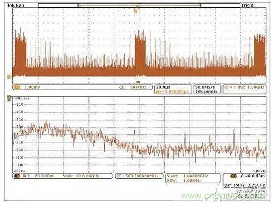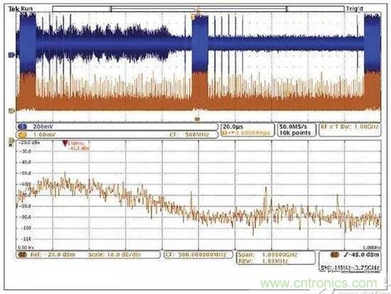 然而,混合域示波器(MDO)的推出使情況有了改觀(guān),它能提供同步的而且與時(shí)間相關(guān)聯(lián)的觀(guān)察和測(cè)量功能。如圖5所示的這種儀器能夠相當(dāng)容易地讓我們觀(guān)察哪個(gè)信號(hào)與哪個(gè)EMI事件同時(shí)發(fā)生,從而可以簡(jiǎn)化EMI排查過(guò)程。