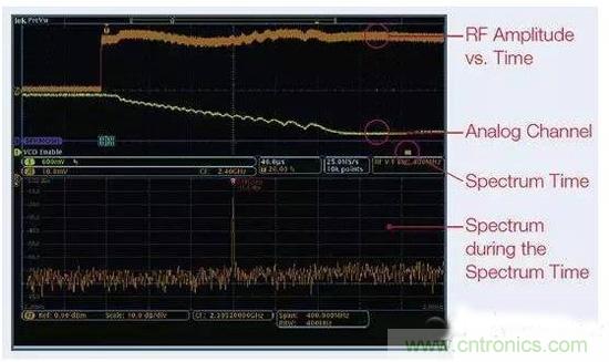 圖6:這張圖顯示了MDO提供的時(shí)間關(guān)聯(lián)觀(guān)察功能,圖中顯示了射頻幅度與時(shí)間的關(guān)系軌跡。