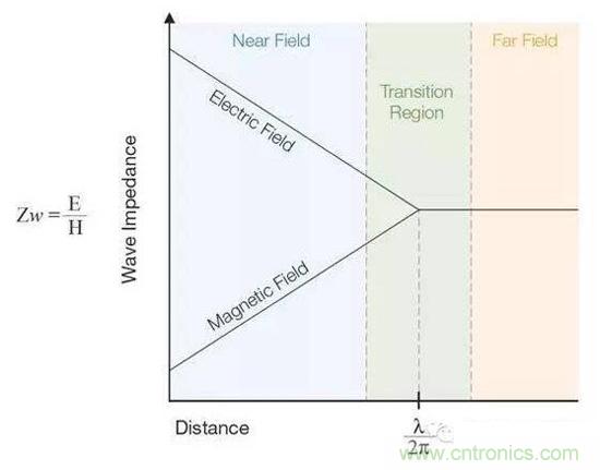 圖7:這張圖顯示了近場(chǎng)和遠(yuǎn)場(chǎng)中的波阻行為以及兩者之間的過(guò)渡區(qū)。近場(chǎng)測(cè)量可用于EMI排查。