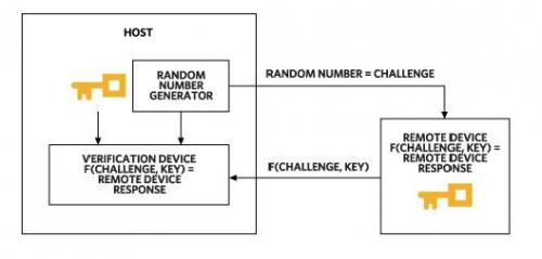 對稱加密安全認(rèn)證依賴于共享密鑰。主機和被認(rèn)證設(shè)備持有相同的密鑰。主機向設(shè)備發(fā)送一個隨機數(shù),即質(zhì)詢。設(shè)備計算一個數(shù)字簽名,該簽名是密鑰和質(zhì)詢的函數(shù),并發(fā)送回主機。主機執(zhí)行相同的運算并對結(jié)果進行比較。如果兩項計算結(jié)果一致,則設(shè)備通過安全認(rèn)證(圖1)。為了確保結(jié)果不被模仿,必須使用數(shù)學(xué)屬性足夠的函數(shù);例如必須保證不可能通過計算結(jié)果獲得密鑰。SHA-256等安全散列函數(shù)滿足這些要求。對于質(zhì)詢-應(yīng)答方法,設(shè)備在不泄露密鑰的情況下證明自己知道密鑰。即使攻擊者攔截通信,也無法接觸到密鑰。