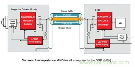 專用高速視頻鏈路將車內的每個顯示屏或攝像頭連接到控制(頭端)單元。最簡單的是使用單條同軸線纜將來自后端攝像頭的 NTSC (CVBS) 信號顯示在中央控制臺的屏幕上。然而,現(xiàn)在的趨勢顯然是利用百萬像素數(shù)字攝像頭提高顯示在高分辨率 LCD 面板上的畫面清晰度與質量。