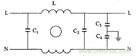 交流電源輸人線上存在以上兩種干擾,通常為低頻段差模干擾和高頻段共模干擾。在一般情況下差模干擾幅度小、頻率低、造成的干擾小;共模干擾幅度大、頻率高, 還可以通過導(dǎo)線產(chǎn)生輻射,造成的干擾較大。若在交流電源輸人端采用適當(dāng)?shù)腅MI濾波器,則可有效地抑制電磁干擾。電源線EMI濾波器基本原理如圖1所示, 其中差模電容C1、C2用來短路差模干擾電流,而中間連線接地電容C3、C4則用來短路共模干擾電流。共模扼流圈是由兩股等粗并且按同方向繞制在一個(gè)磁芯 上的線圈組成。如果兩個(gè)線圈之間的磁藕合非常緊密,那么漏感就會(huì)很小,在電源線頻率范圍內(nèi)差模電抗將會(huì)變得很小;當(dāng)負(fù)載電流流過共模扼流圈時(shí),串聯(lián)在相線上的線圈所產(chǎn)生的磁力線和串聯(lián)在中線上線圈所產(chǎn)生的磁力線方向相反,它們?cè)诖判局邢嗷サ窒?因此即使在大負(fù)載電流的情況下,磁芯也不會(huì)飽和。而對(duì)于共模干擾電流,兩個(gè)線圈產(chǎn)生的磁場(chǎng)是同方向的,會(huì)呈現(xiàn)較大電感,從而起到衰減共模干擾信號(hào)的作用。 這里共模扼流圈要采用導(dǎo)磁率高、頻率特性較佳的鐵氧體磁性材料。