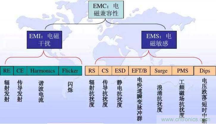 電磁兼容性(EMC)是指設(shè)備或系統(tǒng)在電磁環(huán)境中符合要求運(yùn)行并不對(duì)其環(huán)境中的任何設(shè)備產(chǎn)生無(wú)法忍受的電磁干擾能力,電磁兼容(EMC)包含電磁干擾(EMI)和電磁抗擾度(EMS)。其包含的測(cè)試項(xiàng)目如圖1所示。