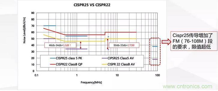 歷史上普遍接受的國(guó)際電磁干擾標(biāo)準(zhǔn)是CISPR-22,美國(guó)的電磁干擾標(biāo)準(zhǔn)是FCC,CISPR-22與FCC有所不同,但一般來(lái)說(shuō)如果電源符合CISPR-22標(biāo)準(zhǔn),那么它也符合FCC標(biāo)準(zhǔn)。總之CISPR-22標(biāo)準(zhǔn)已經(jīng)成為全世界都遵守的基本標(biāo)準(zhǔn)。汽車上的電磁干擾標(biāo)準(zhǔn)是CISPR-25,相對(duì)CISPR22來(lái)說(shuō)CISPR-25標(biāo)準(zhǔn)限制值更低并且額外對(duì)FM頻段做了很嚴(yán)的限制要求。具體傳導(dǎo)測(cè)試限制要求如圖2所示。