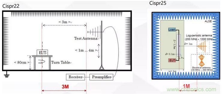 如圖3所示電磁干擾的輻射測(cè)試普遍采用天線接收法測(cè)試,相比于CISPR22來(lái)說(shuō)CISPR25額外增加了150KHz ~ 30MHz的輻射測(cè)試,這部分測(cè)試頻段覆蓋了DCDC的工作頻率范圍,是輻射測(cè)試的難點(diǎn)。另外CISPR-25輻射測(cè)試采用1M法天線距離更近,測(cè)試接收的信號(hào)更強(qiáng)。