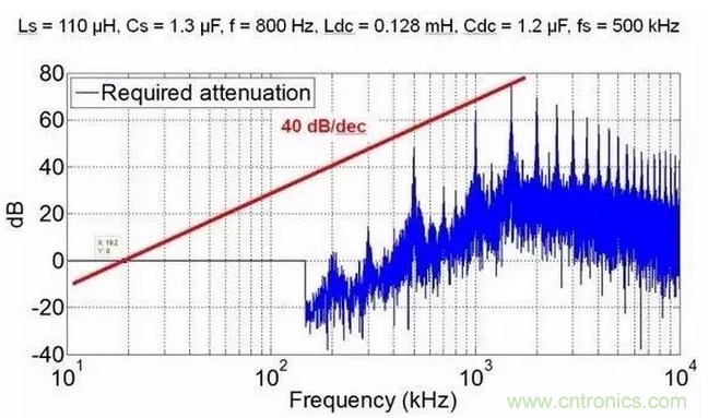 我知道很多人會說,怎么可能,di/dt和dv/dt都大了,怎么可能EMI濾波體積還小了。我想說一句,共模和差模濾波器的沒有區(qū)別,相同的截止頻率下,高頻的衰減更大!就算你高頻下共模噪聲越大,但是你的記住,這個頻率下LC濾波器的衰減更大,想想幅頻曲線吧。為了說明這個結(jié)論,我給出一些定量分析結(jié)果。這些EMI分析均基于AC/DC三相整流,拓撲為維也納整流。我分別給出了1Mhz和500Khz的共模噪聲,可以看出,500khz共模濾波器需要的截止頻率為19.2kHz,1MHz為31.2kHz。