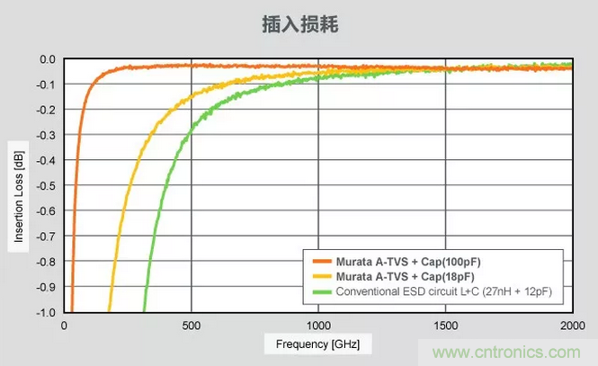 可見(jiàn)低頻帶的A-TVS的插入損耗,比電感器和電容器的組合更低。