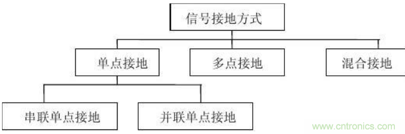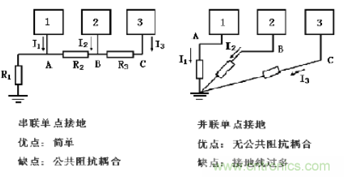 接地沒(méi)有一個(gè)很系統(tǒng)的理論或模型,人們?cè)诳紤]接地時(shí)只能依靠他過(guò)去的經(jīng)驗(yàn)或從書(shū)上看到的經(jīng)驗(yàn)。接地的方法很多,具體使用那一種方法取決于系統(tǒng)的結(jié)構(gòu)和功能。接地的方式可以分為三種:?jiǎn)吸c(diǎn)接地,多點(diǎn)接地和混合接地。其中單點(diǎn)接地可以分為串聯(lián)單點(diǎn)接地和并聯(lián)單點(diǎn)接地兩種,如圖所示。
