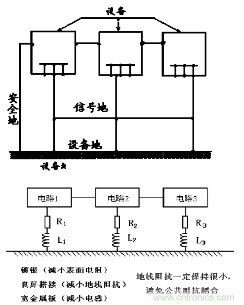 多點(diǎn)接地時(shí)容易產(chǎn)生公共阻抗耦合問(wèn)題。在低頻的場(chǎng)合,通過(guò)單點(diǎn)接地可以解決這個(gè)問(wèn)題。但在高頻時(shí),只能通過(guò)減小地線阻抗(減小公共阻抗)來(lái)解決。在導(dǎo)體表面鍍銀能夠降低導(dǎo)體的電阻,如圖所示。