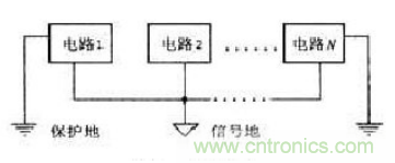 單點(diǎn)接地連接是指在產(chǎn)品的設(shè)計(jì)中,接地線路與單獨(dú)一個(gè)參考點(diǎn)相連,該點(diǎn)常常以地球?yàn)閰⒖?,如圖所示。