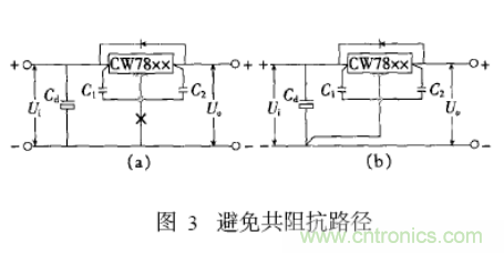 電源線的布置要根據(jù)電流的大小盡量加粗走線寬度。在布線工作的最后,用地線將電路板沒(méi)有走線的地方鋪滿(大面積) 。在接地時(shí)還需要避免共阻抗路徑,如圖8-10所示穩(wěn)壓器電路的“調(diào)整端的取樣點(diǎn)”或“公共點(diǎn)”,千萬(wàn)不能接在有負(fù)載電流流過(guò)的輸出線和公共地線上如圖(a)所示,應(yīng)從管腳’根部’單獨(dú)另外用引線引出如圖(b)所示。