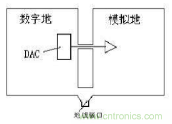 接地技術(shù)中還有一個(gè)很重要的部分就是數(shù)字電路與模擬電路的共地處理。一般說(shuō)來(lái),數(shù)字電路的頻率高,而模擬電路的對(duì)噪聲的敏感度強(qiáng),正因?yàn)槿绱?,高頻的數(shù)字信號(hào)線要盡可能遠(yuǎn)離敏感的模擬電路器件,同樣,彼此的信號(hào)回路也要相互隔離,這就牽涉到模擬和數(shù)字地的劃分問(wèn)題。一般的做法是,模擬地和數(shù)字地分離,只在某一點(diǎn)連接,這一點(diǎn)通常是在PCB板總的地線接口處,或者在數(shù)模轉(zhuǎn)換器的下方,必要時(shí)可以使用磁性元件(如磁珠)連接,如圖所示。