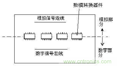 另外,也有一種統(tǒng)一地的處理方法,也就是不進(jìn)行地分割,但規(guī)定各自的范圍,保證數(shù)字和模擬走線及回流不會(huì)經(jīng)過(guò)對(duì)方的區(qū)域。這種策略一般實(shí)用于數(shù)模器件比例相當(dāng),并存在多個(gè)數(shù)模轉(zhuǎn)換器件的情況,有利于降低地平面的阻抗,參考地線設(shè)計(jì)如圖8-13所示: