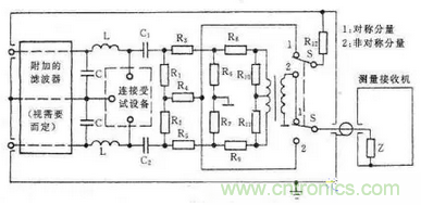 連續(xù)騷擾電壓測量主要測量EUT沿著電源線向電網發(fā)射的騷擾電壓,測量頻率為0.15~30MHz。測量一般在屏蔽室內進行。測量時需要在電網和EUT之間插入一個人工電源網絡(LISN或AMN),其原理如圖15所示。AMN的作用是隔離電網和EUT,使測到的騷擾電壓