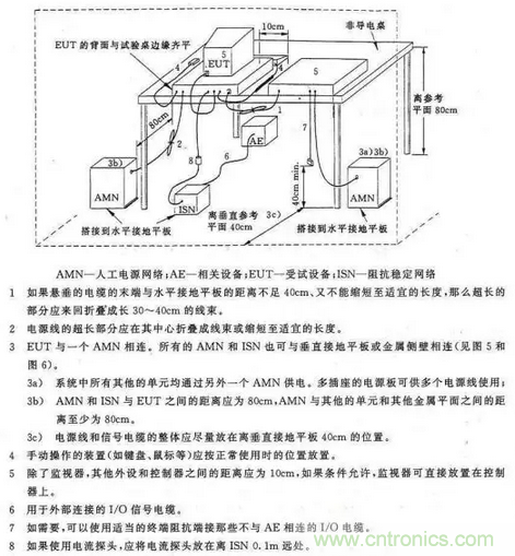 僅是EUT發(fā)射的,不會有電網的騷擾混入。另一作用是為測量提供一個穩(wěn)定的阻抗,因為電網的阻抗是不確定的,阻抗不一樣EUT的騷擾電壓值也不相同,所以要規(guī)定一個統(tǒng)一的阻抗,通常為50Ω。AMN實際上是個雙向低通濾波器,電網中的騷擾由50μH和1.0μF的濾波器濾掉,不能進人騷擾測量儀,而EUT發(fā)射的騷擾由于50μH濾波器的阻擋不能進人電網,只能通過0.1μF電容進入騷擾測量儀。測量儀的輸入阻抗是50Ω,所以EUT騷擾的負載阻抗約等于50Ω。對于50Hz的工頻電源,仍然可以通過AMN向EUT供電。圖15中的AMN僅是一種基本結構,由基本結構可以組成V型AMN,用于測量電源中相線—地線和零線—地線的不對稱騷擾電壓,見圖16。也可組成Δ型AMN,除了測量線-地間的不對稱騷擾電壓外還可以測量相線—零線間的對稱騷擾電壓,見圖17。測量時EUT和AMN的布置、連接線的長度和走向等都應按標準規(guī)定的要求進行。AMN外殼要良好接地,否則將影響電網和EUT之間的隔離。圖18為臺式設備的傳導騷擾測量布置圖。