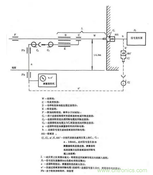 其中C是電流探頭,包括鐵氧體環(huán)和探測線圈,作用是測量電源線上的騷擾共模電流。D是鐵氧體環(huán)組,作為騷擾共模電流的穩(wěn)定負載,吸收騷擾功率,并用于隔離EUT和電網。如果在50MHz以下鐵氧體環(huán)組D不能充分起到射頻隔離作用,則應在電網端再加一個輔助吸收鉗F,它也是由鐵氧體環(huán)組成。E也是鐵氧體環(huán)組,用于吸收外場在電流探頭引出電纜上產生的共模電流,以免影響測量結果。測量布置如圖19(b)所示,測試應在屏蔽室內進行,電源線長度應大于6m,即大于30MHz的半波長加上吸收鉗的長度。對于每一個測試頻率點,吸收鉗都應沿著電源線移動,找出最大值,因為共模電流在導線上是以駐波形式出現(xiàn)的。功率吸收鉗測量系統(tǒng)應事前進行校準,得到修正因子—頻率曲線。校準布置如圖20所示。
