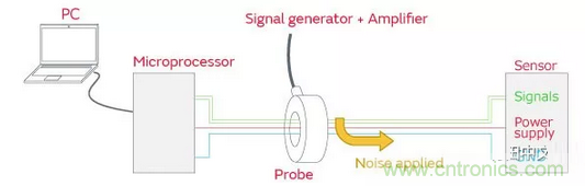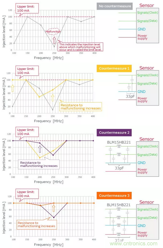 傳感器的信號線收到噪聲影響,傳感器的通信會發(fā)生停止。提高注入的噪聲水平,調查能夠正常工作(不發(fā)生誤操作)的水平極限。