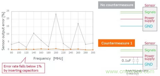傳感器的電源線受噪聲影響,會發(fā)生傳感器輸出值的異常(輸出誤差)。將注入電源線的噪聲級固定,對對策前后的輸出誤差的大小進行調查。