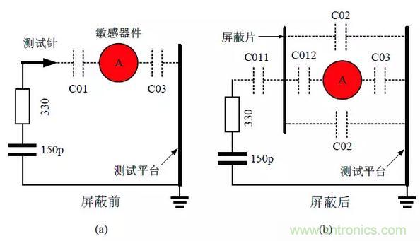 這里需要特別說明的是,對ESD 進行靜電屏蔽防護的金屬屏蔽片是可以不需要接地的。經(jīng)屏蔽之后,在屏蔽片與大地之間就會增加一個分布電容C02,C02對C011 在C012、C03 產(chǎn)生的電壓起到分壓作用,因此,C02 與C012、C03 之比,越大越好,而C01=C011+C012=2C012(假說C011=C012)。加大C02 要盡量加大屏蔽片的有效面積,而減小C01,則應(yīng)該盡量讓A 遠離測試探頭和機殼,并把敏感器件A 置于公共地的包圍圈之中。金屬屏蔽片一般選用如過濾嘴香煙包裝盒中的錫箔片最為簡便。
