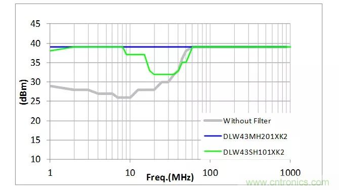 【導(dǎo)讀】支持CAN、FlexRay的DLW43SH101XK2在有些頻率下噪聲會增加,降噪效果不佳,但使用支持100Base-T1的DLW43MH201XK2能有效地降噪。