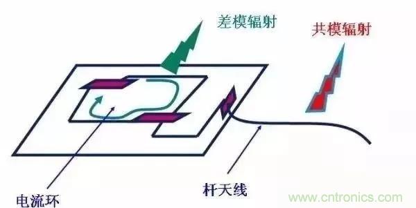 這個(gè)圖可能有些抽象,不過(guò)正好EMC是很難做到具體,需要給到我們一些啟示,可知:差模輻射是以環(huán)路的形式存在,而共模輻射是以天線的形式發(fā)射;因此正好印證前面說(shuō)我們布板的時(shí)候開(kāi)關(guān)環(huán)路的布局以及走線的時(shí)候不要走銳角,常規(guī)走45度,最好是圓弧走線,當(dāng)然走線效率會(huì)比較低;