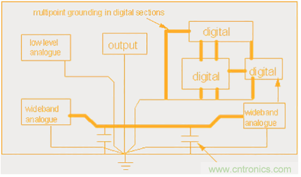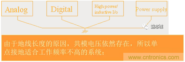 d、接地:同類電路單獨(dú)分布地,在單板上單點(diǎn)相連