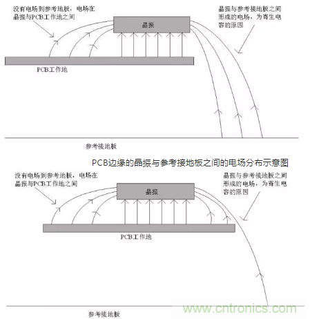 從圖中可以看出,當晶振布置在PCB中間,或離PUB邊緣較遠時,由于PCB中工作地(GND)平面的存在,使大部分的電場控制在晶振與工作地之間,即在PCB內(nèi)部,分布到參考接地板去的電場大大減小,導(dǎo)致輻射發(fā)射就降低了。