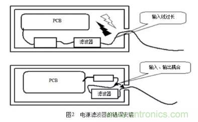 主要考慮(1)抑制工作頻帶以外的干擾;(2)在信號電路中用吸收濾波器消除無用的頻譜成分;(3)在電源電路(尤其是開關(guān)電源中),操縱電路,控制電路,以及轉(zhuǎn)換電路中消除產(chǎn)生的干擾。在工程實(shí)際中,一個最值得注意的地方是電源濾波器的安裝,常見的濾波器的錯誤安裝如圖2所示。