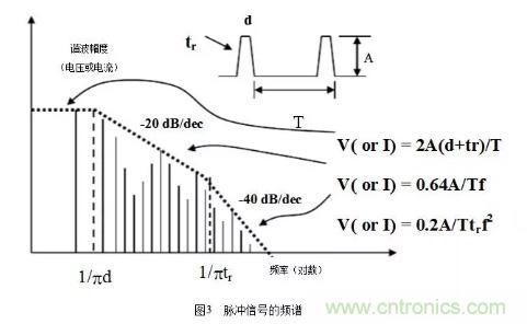 在EMC中,除了基本頻率外,還需考慮諧波因素,通常取十倍頻,但在數(shù)字電路中卻有些不同,比如在時鐘電路和邏輯門電路中,輻射帶寬與數(shù)字信號的上升沿或下降沿有關(guān)系,而不是數(shù)字信號的重復(fù)周期,其關(guān)系為:rtF?/1max?,其中rt是脈沖的上升沿時間。例如,典型時鐘驅(qū)動的邊沿速率是2ns,此時,maxF≈160MHz,再考慮十倍頻,則此時鐘電路可能產(chǎn)生直到1.6GHz的輻射帶寬。所以在選擇器件時要選擇慢速的邏輯器件系列,因?yàn)槠骷﹄姶泡椛湄暙I(xiàn)的大小與工作頻率無直接關(guān)系而只取決于邊沿速率(這和從電路功能設(shè)計上選擇快速器件是矛盾的,在電路設(shè)計時需要折中考慮)。還有從器件的抗擾能力上來說,CMOS器件是最好的,因?yàn)樗脑肼暼菹薷?。從封裝上來說,BGA是最好的,因?yàn)樗囊€很短。脈沖信號的頻譜如圖3所示。
